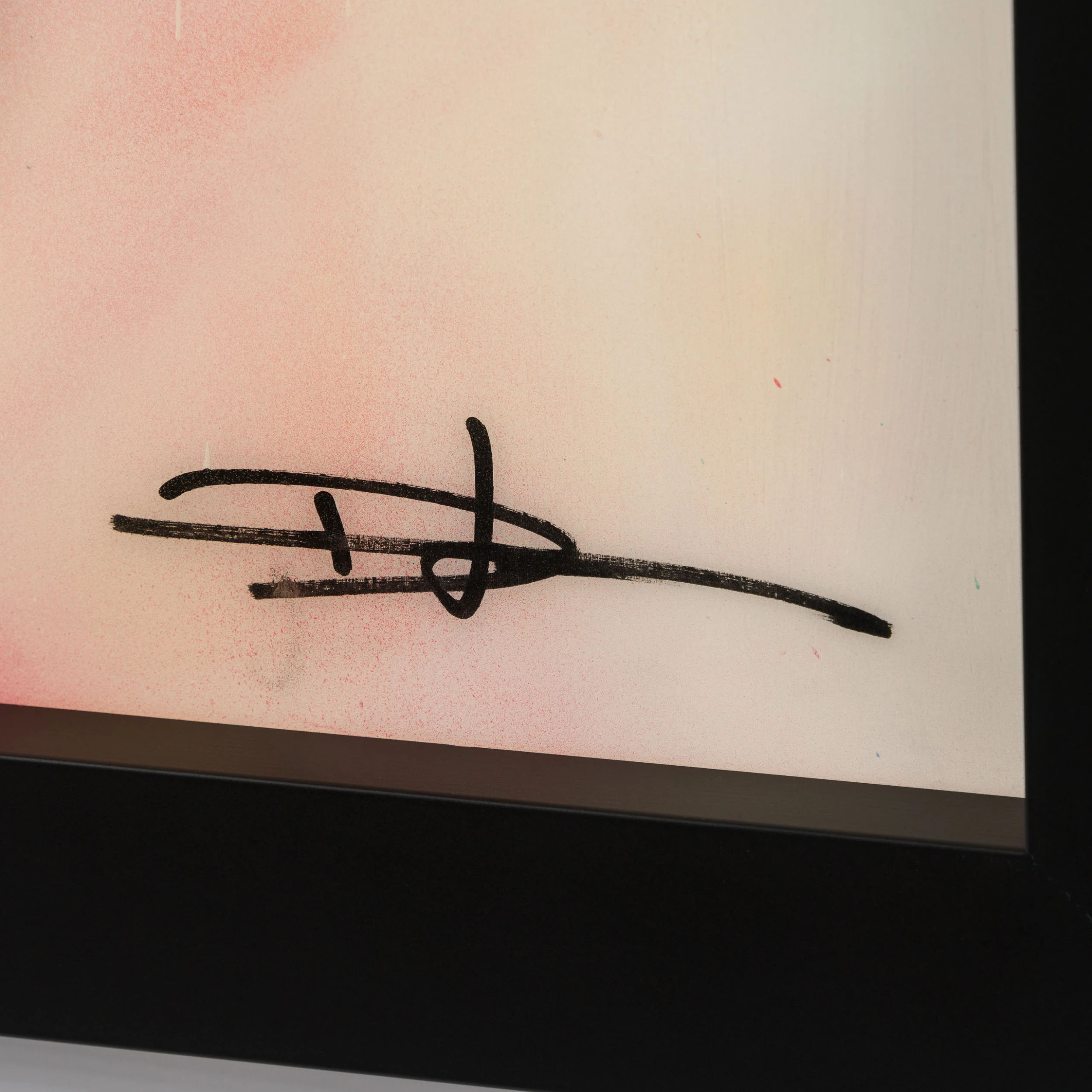 This iconic original resembles the portraits of some of the most classical works from Baroque and Renaissance masters whilst featuring the artist most popular symbols – the graffiti and the writing.