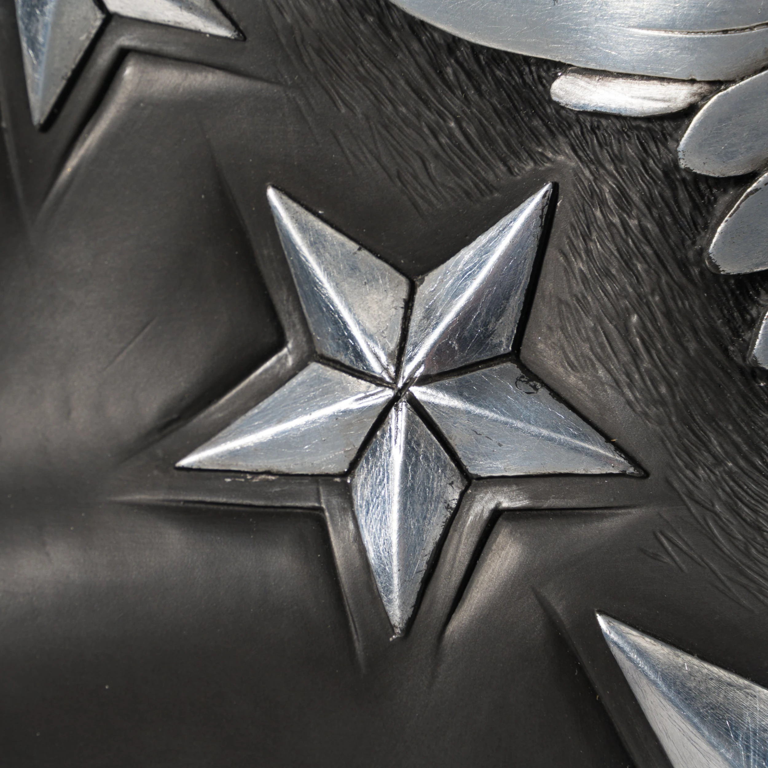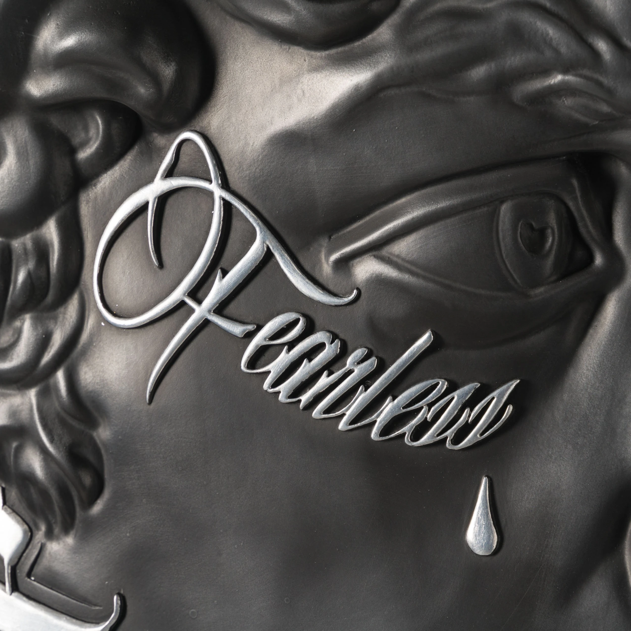 In this bold and luxurious original, Dan Lane revisits some of his beloved themes from his earlier work. In “Underestimated”, the artist fuses his classical baroque sculpture style and the drama they convey with his own style and its iconic elements. Whilst this iron and silver leaf piece is bold and dramatic, the title evokes an element of humbleness and simplicity.