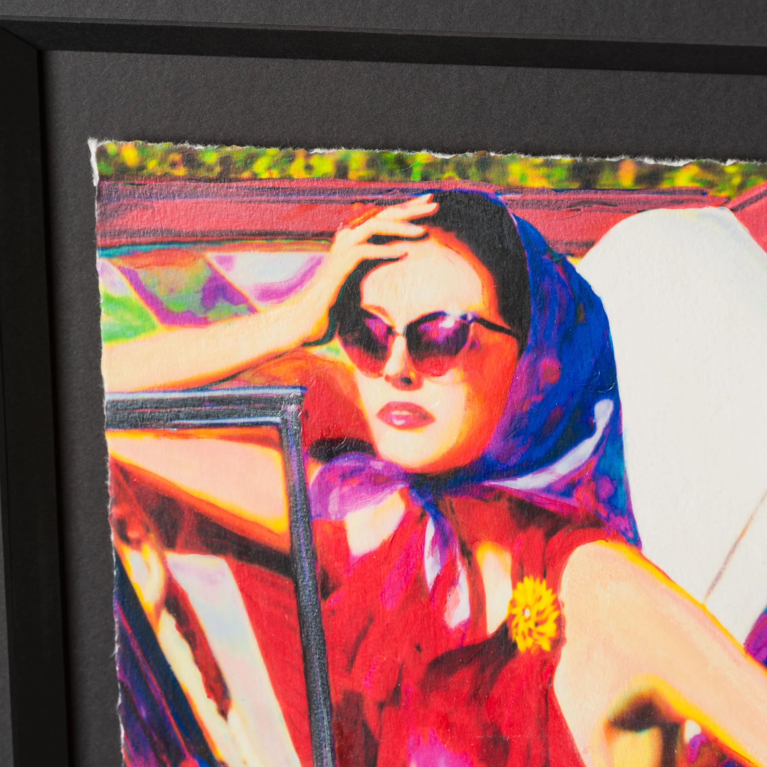 In “When Spring Comes Back”, the colourist portrays the model is warm red and pink tones remittent of spring. With the model taking centre stage, the car falls into second plan. The green flowery background created texture and is complemented by the main colours of this piece. This piece is a soft blurred colours imagery utilising a softer and more tonal colour palette. This iconic original is a statement piece!