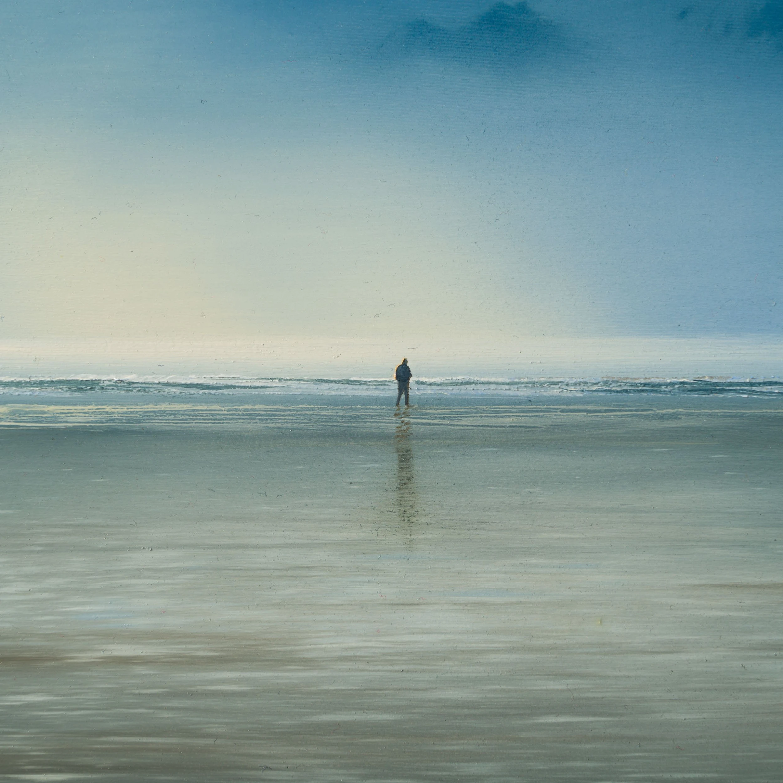Although oil paint has traditionally been used in landscape painting for hundreds of years, Lawrence’s technique of applying the paint is truly unique. After denoting the horizon in a thin pencil line, Lawrence uses only his finger to apply and blend his paint before using a toothpick to add any small figures in his vast composition.
