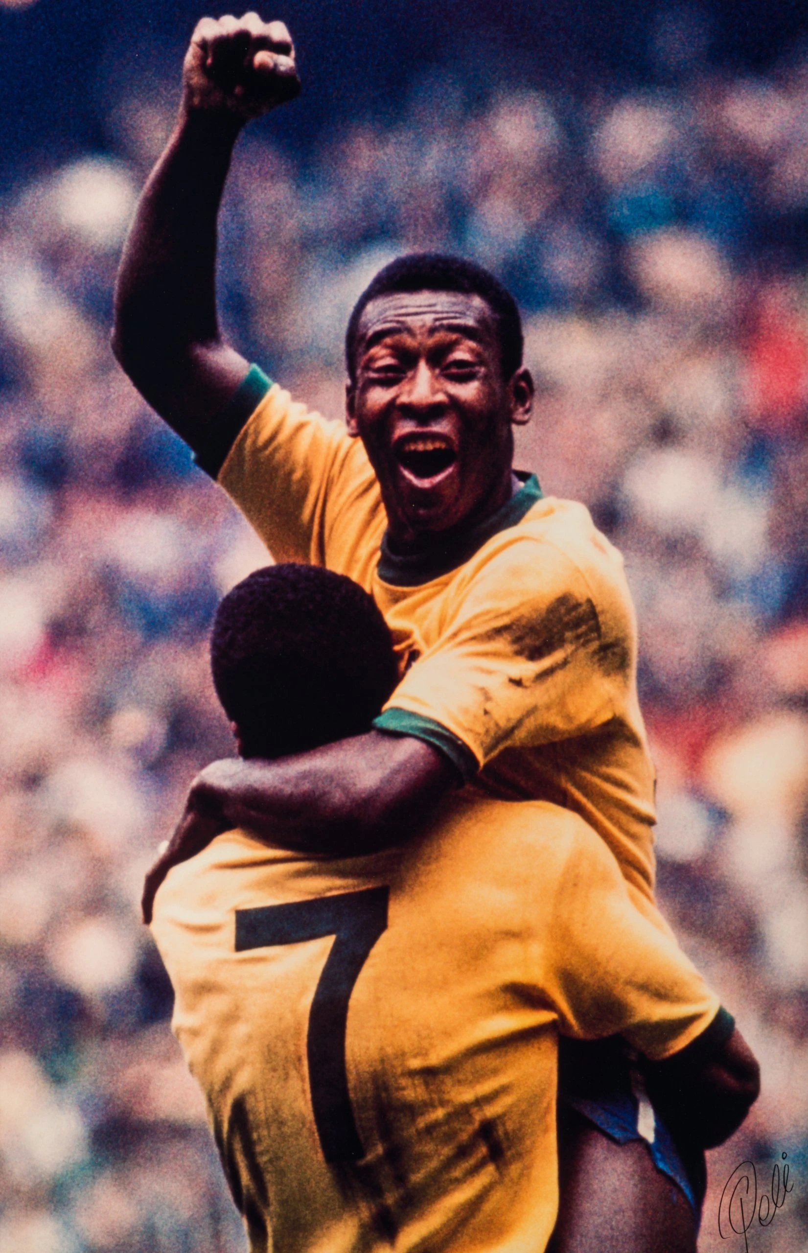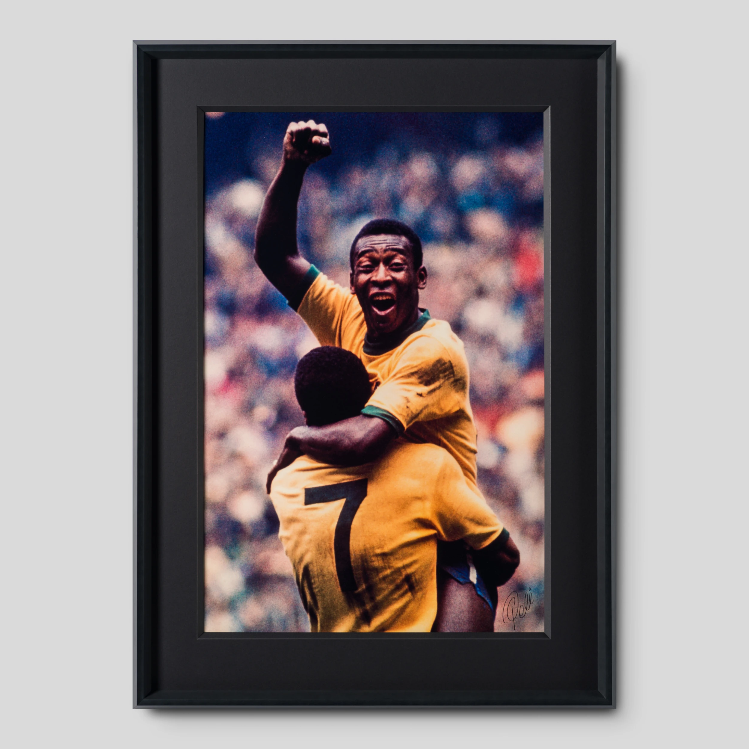 Named ‘Football Player of the Century’ by FIFA, Pelé is one of the most celebrated football players in history. The only man to win the World Cup three times, the Brazilian footballer had tremendous vision and an electrifying pace, having set numerous records at international level. Hand-signed by Pelé himself, this captivating photograph captures not only his skills on the field and as a player, but the passion and humility of the man behind the legend, in this case in a celebration for winning the FIFA World Cup in 1970 when Brazil won against Italy.