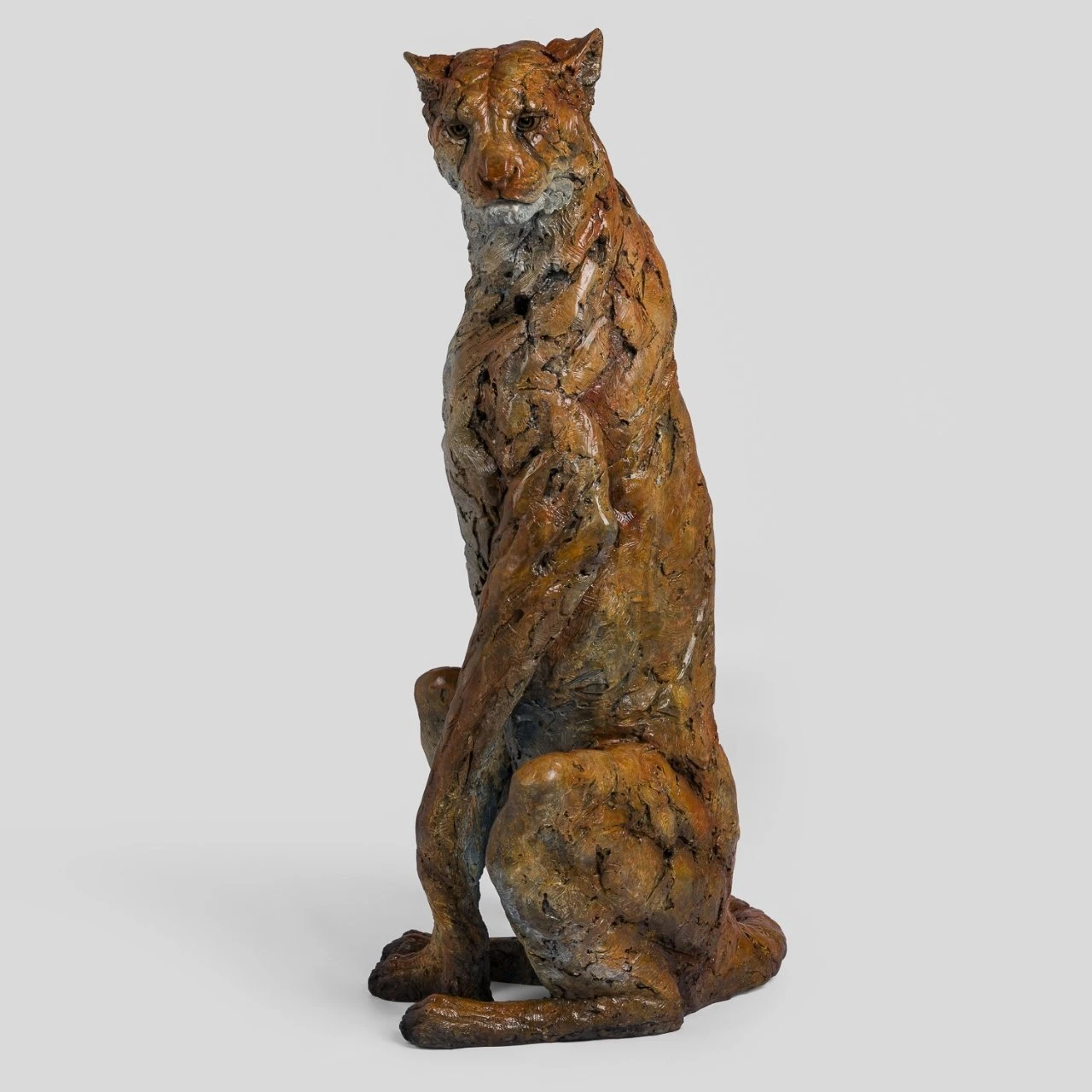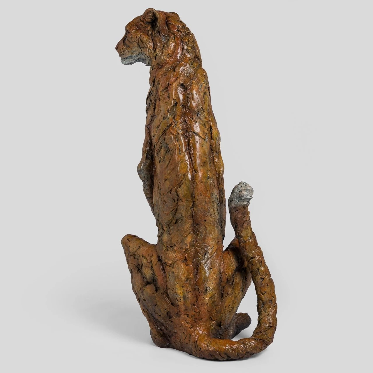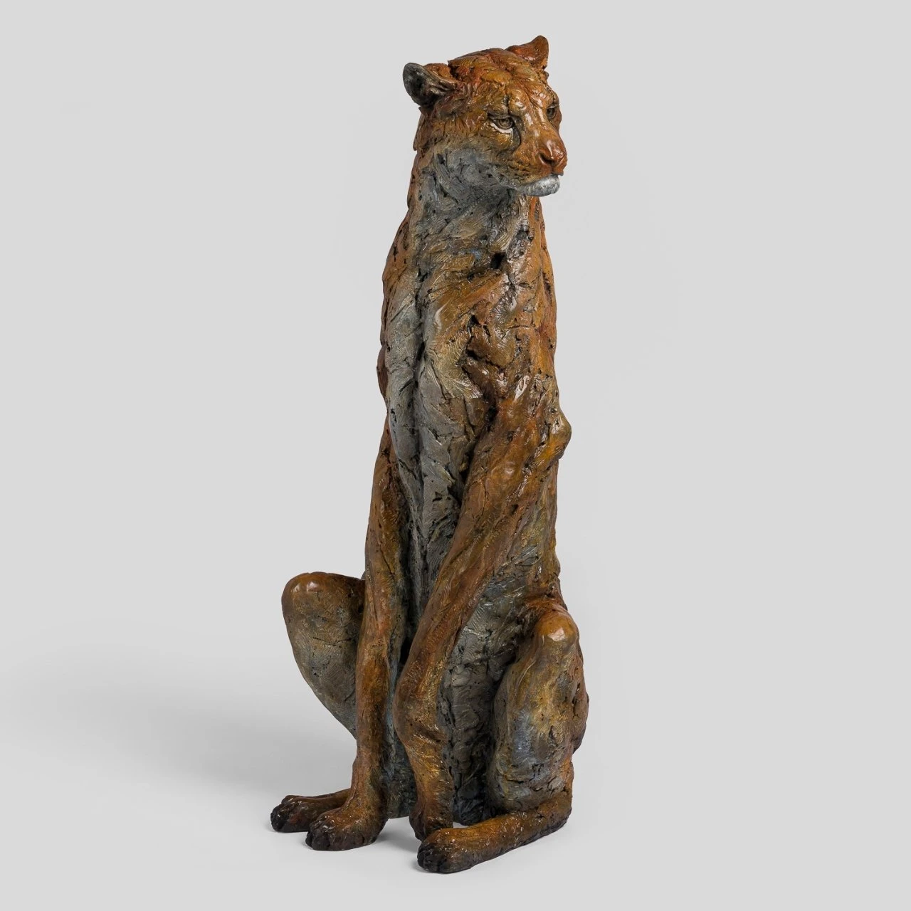 As with all of the wildlife sculptures Steve Winterburn is synonymous with, Zephyr has been expertly crafted and moulded to the unique structure of the Cheetah. This sandy, tan patina used on the body of the cheetah, perfectly resembles the natural colour of the cat. The tactile and textural qualities of the bronze highlight the indents, giving the illusion of spots on the animals coat.